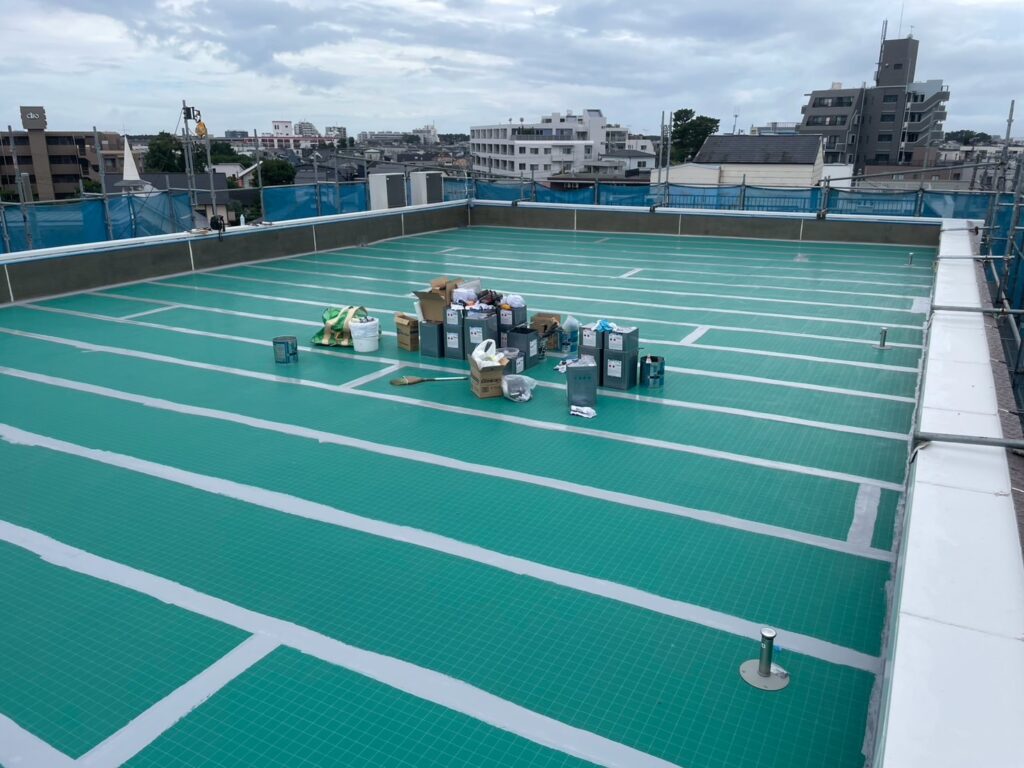 塗りムラが出ないよう区画ごとにわけ、防水層が均一な厚みになるよう丁寧に施工を行いました。