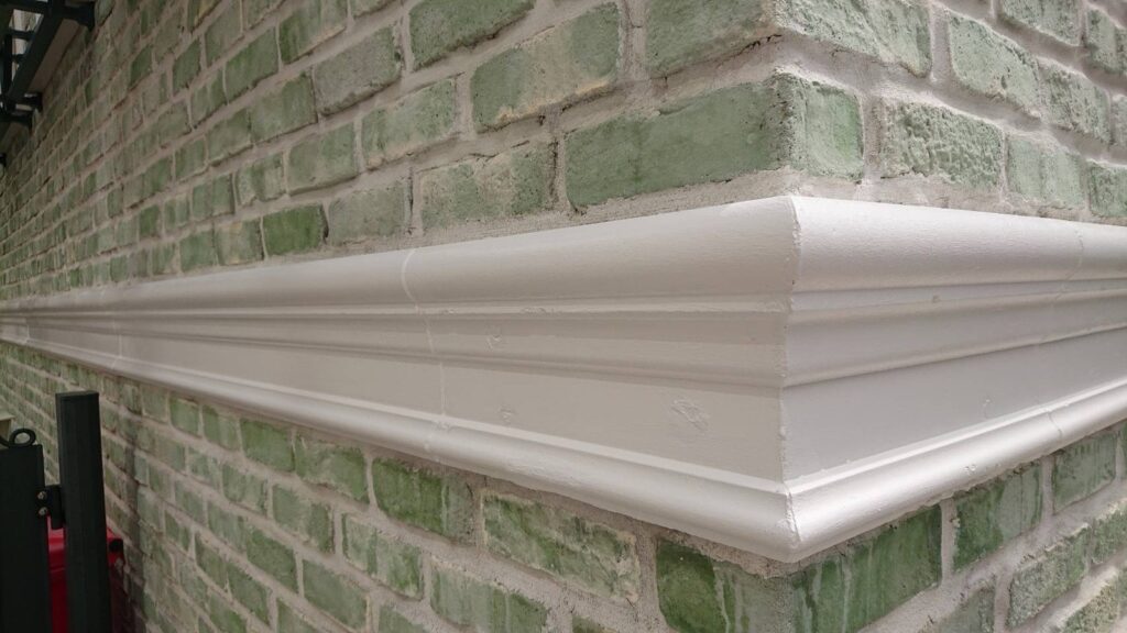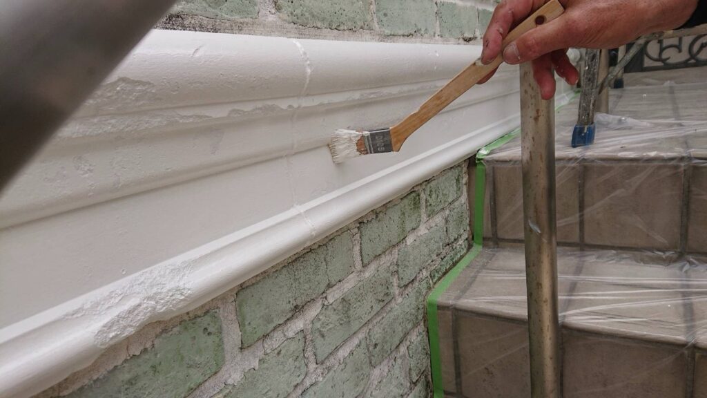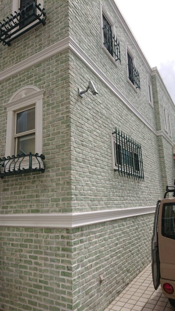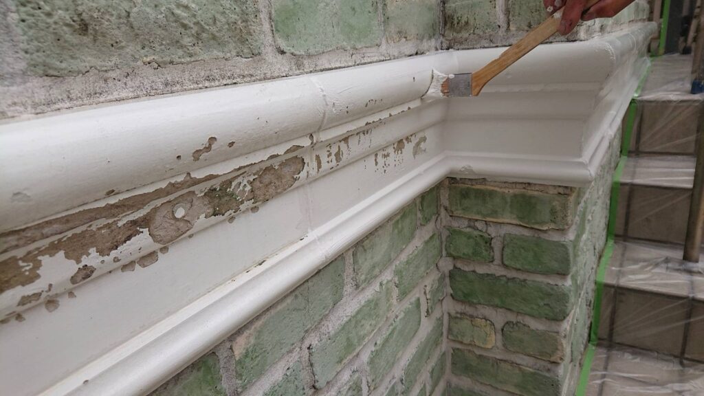 レンガ部分は汚れが蓄積し、白い帯部分は塗膜の剥がれが発生していました。