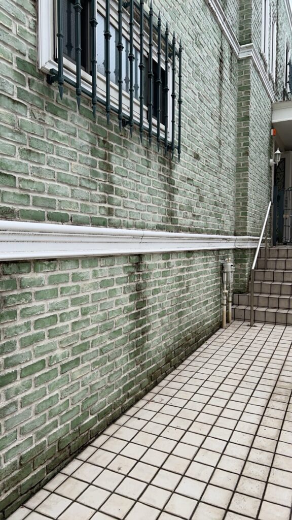 レンガ部分は塗膜の劣化こそ見られなかったものの、長年の雨だれや排気ガス、埃などの汚れが目立つ状態でした。
