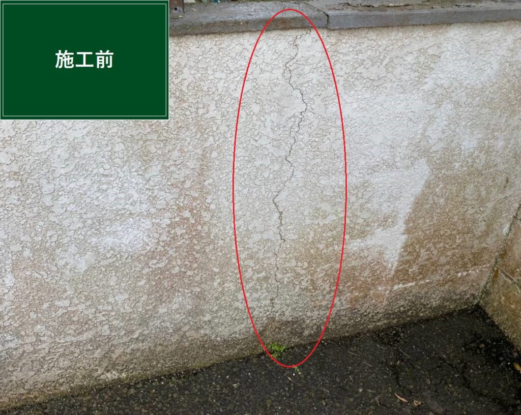 駐車場横の外壁は塗装の剥がれやヒビ、換気口の錆など修繕が必要な箇所が散見されました。