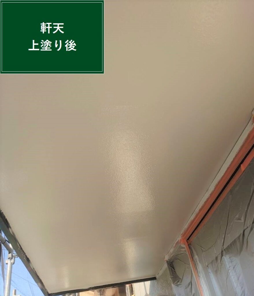 軒天は屋根の裏側部分で、湿気のこもりやすい場所です。カビや汚れが付着している場合は洗浄・修繕を行ったうえで、下塗り・中塗り・上塗りと三回塗装を行います。上塗り後、白さが戻り清潔感のある美しい外観へと変わりました。