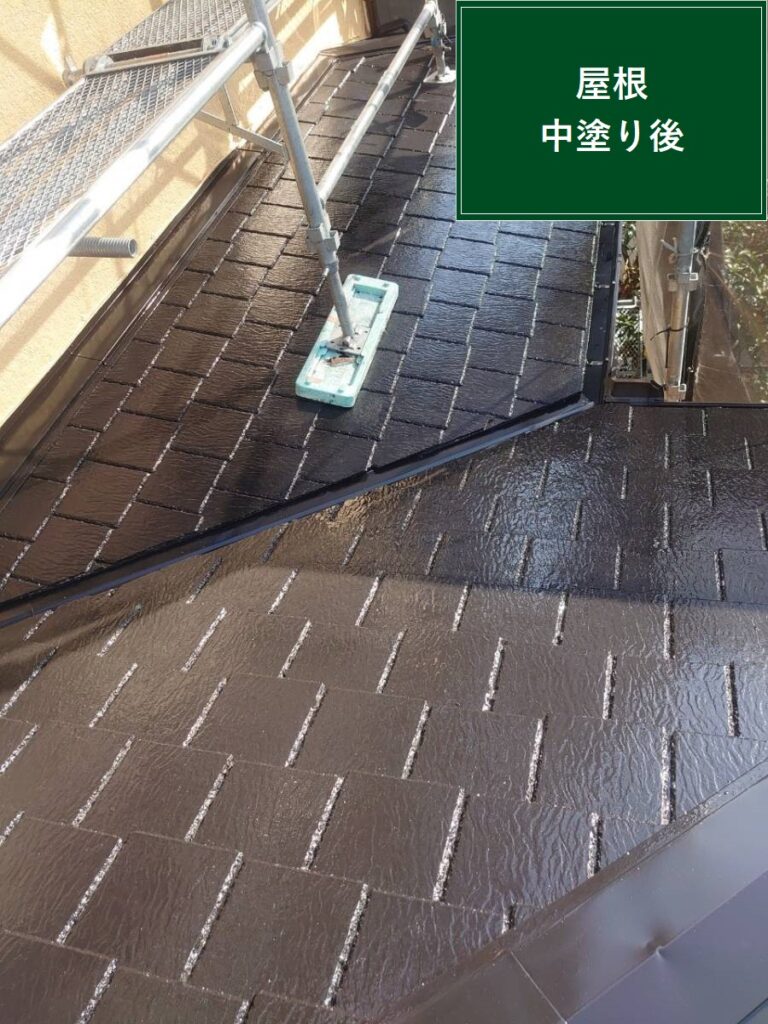 屋根の塗装も丁寧に下塗り・中塗り・上塗りと三回塗装を重ねていきます。下塗りは外壁と塗装をしっかり密着させる役割があります。下塗りを丁寧に行うことで、この後の塗装の仕上がりが格段によくなり、剥がれや浮きを防いでくれます。続いて中塗り、上塗りと進みます。同じ塗料を重ねることで厚みを出し、ムラをなくすだけでなく長持ちする外壁を作っていきます。