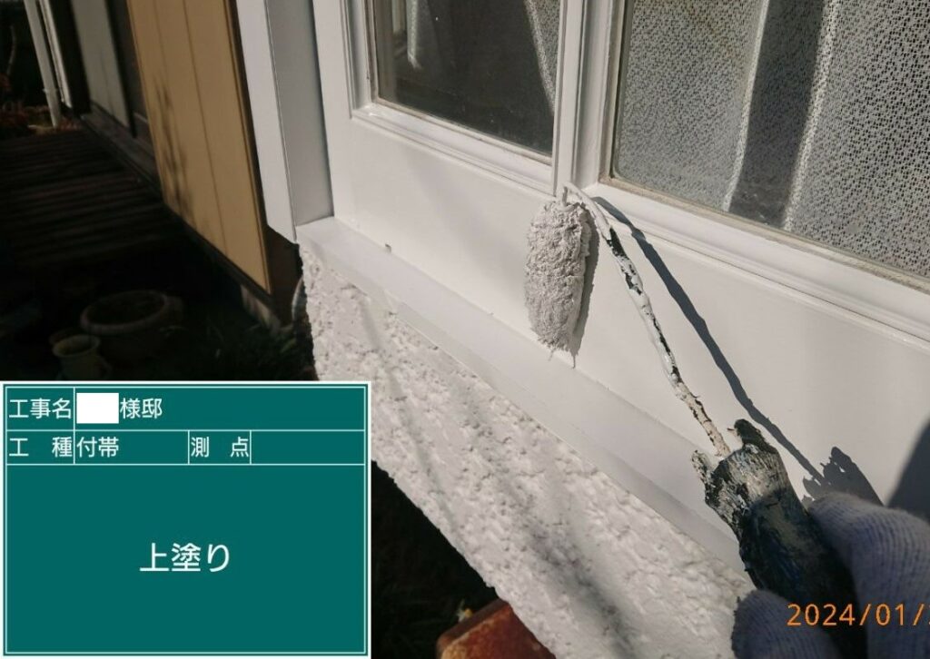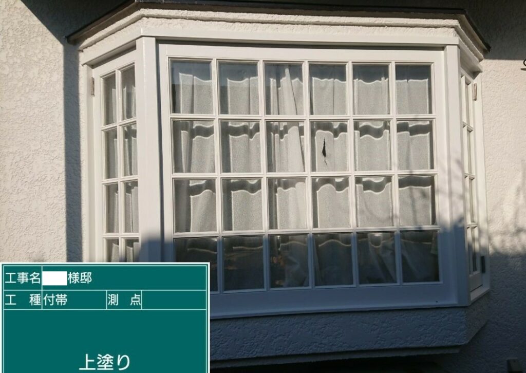 出窓まわりは段差や窓枠まわりなど細かい箇所が多い為、刷毛をつかって細部まで丁寧に塗装していきます。こうした細部の仕上げが、見た目の美しさや耐久性に大きく関わります。