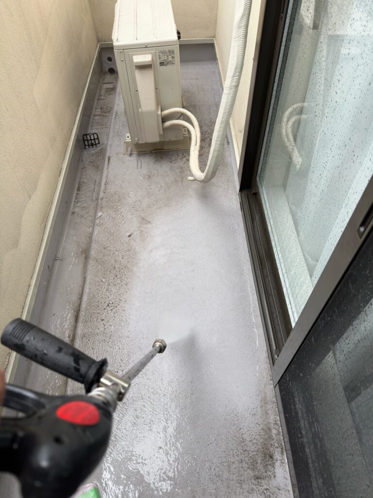 高圧洗浄で外壁や付帯部に付着した埃や汚れ、古い塗膜などを洗い流し、下地を整える作業です。