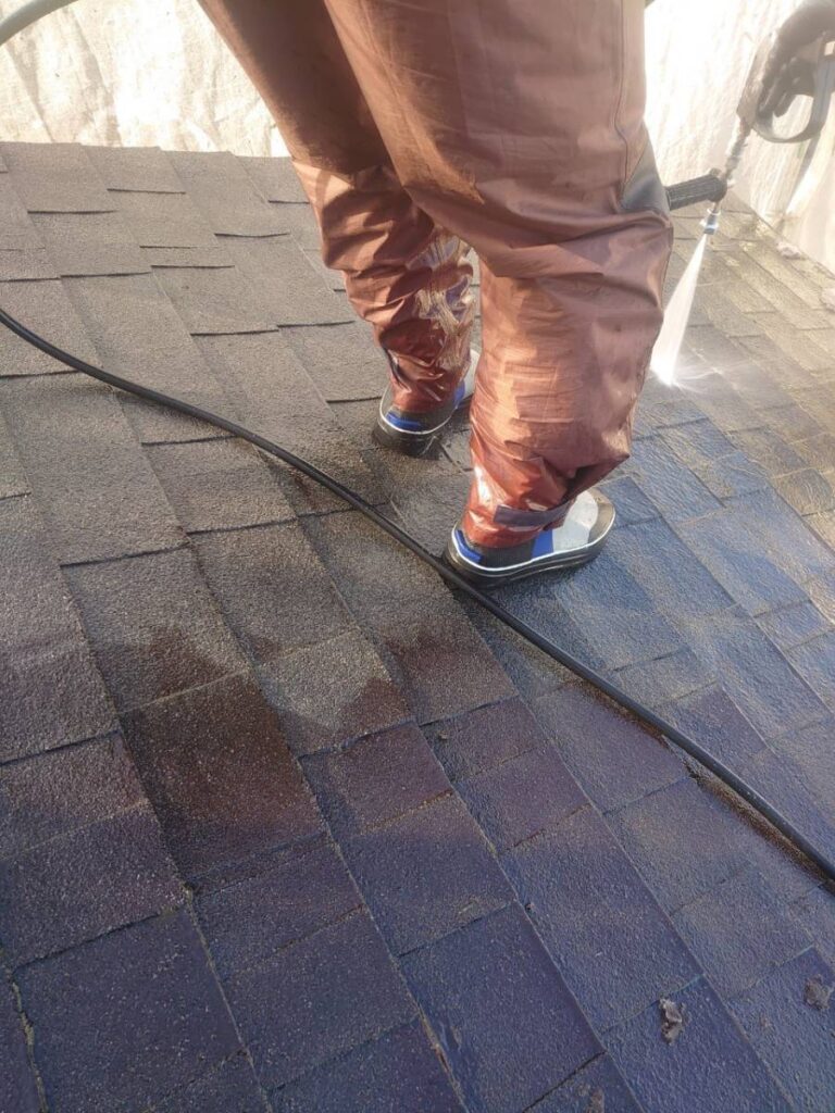 屋根は日当たり・湿気の影響を受けやすい為、コケ・汚れ・旧塗膜の粉が付着してしまいます。