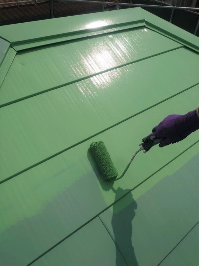 屋根塗装は基本の三度塗り。ムラのない艶やかな屋根に蘇りました。「下塗り」でしっかり土台を作り、「中塗り」で厚みを持たせ、「上塗り」でムラのない美しい屋根に仕上げます。今回はお色を変えたので大分イメージも変わり素敵な雰囲気のお住いに大変身しました。