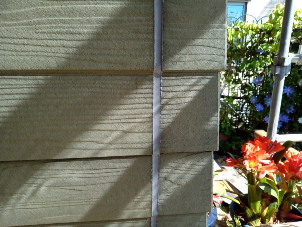 外壁材の継ぎ目(目地)に、新しいコーキング材を充填している様子です。