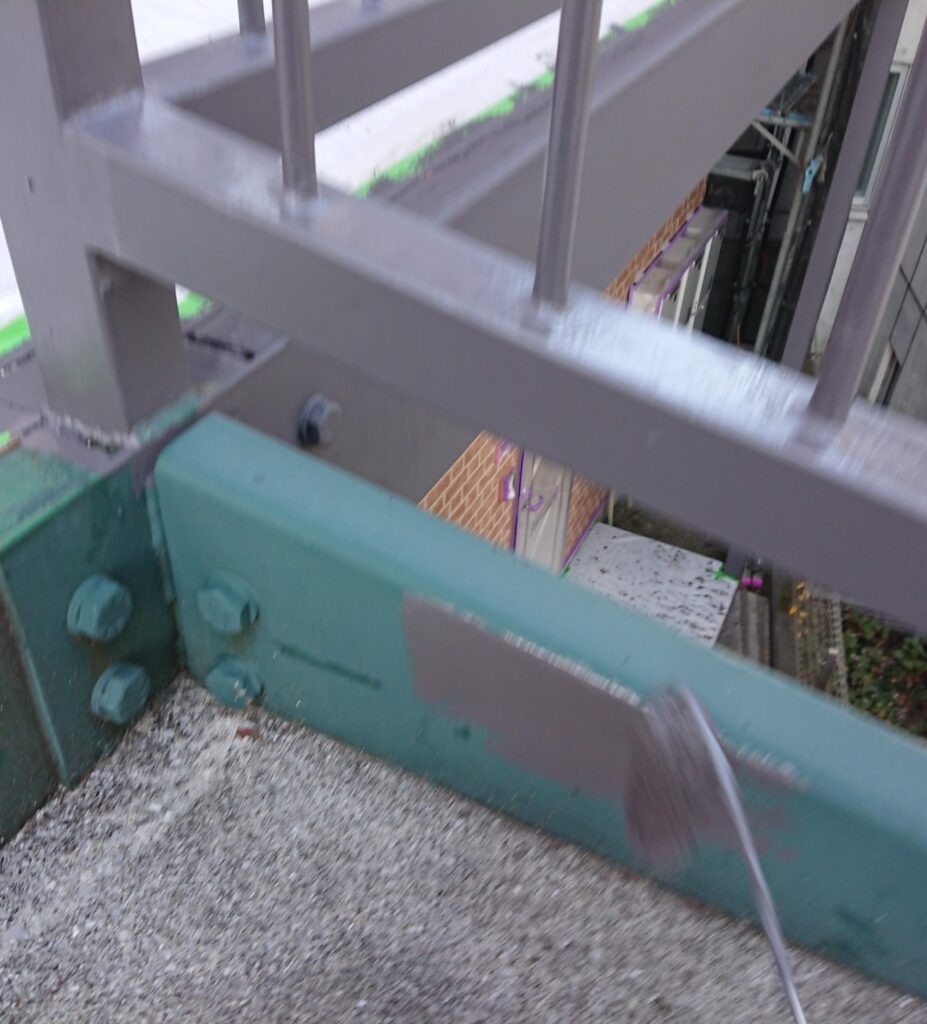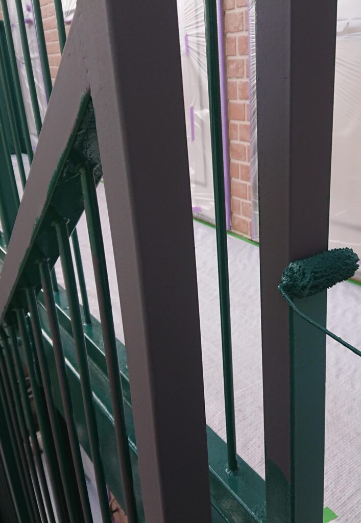 今回の現場でも、階段は全体的に白っぽく色あせ、2階の柵も艶がなくなりサビが出かけている部分も見られました。↓↓↓