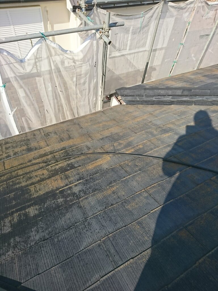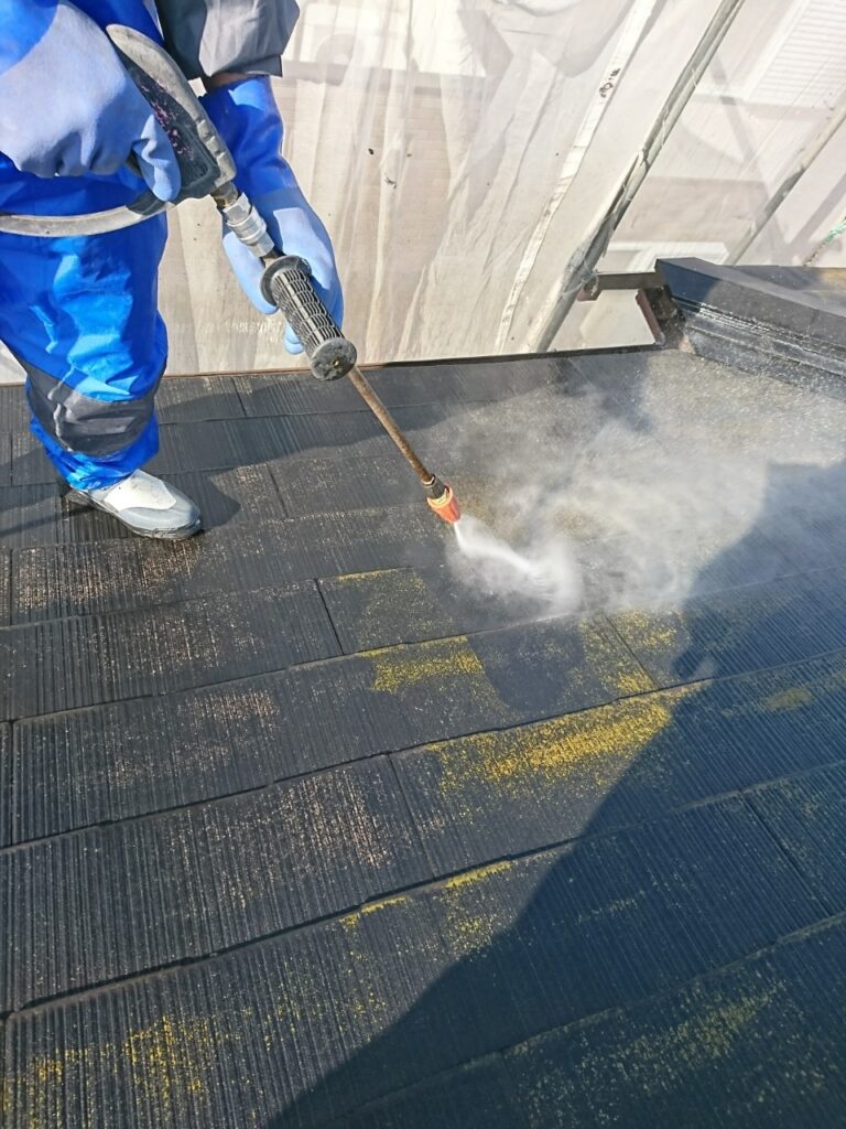まずは高圧洗浄で、屋根表面の汚れ・コケ・古い塗膜をしっかり除去します。