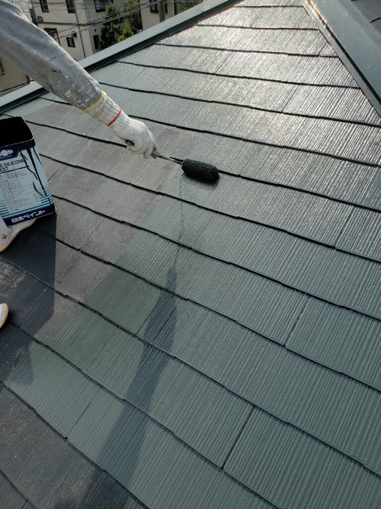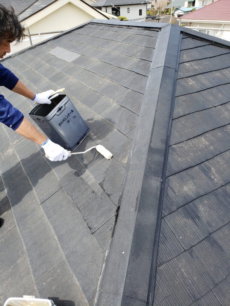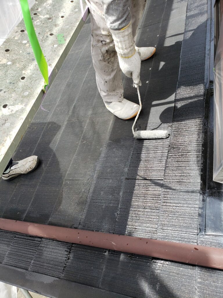 洗浄後、下塗りを行います。下塗りは屋根材と塗料をしっかり密着させるための重要な工程で、仕上がりや耐久性に大きく影響します。