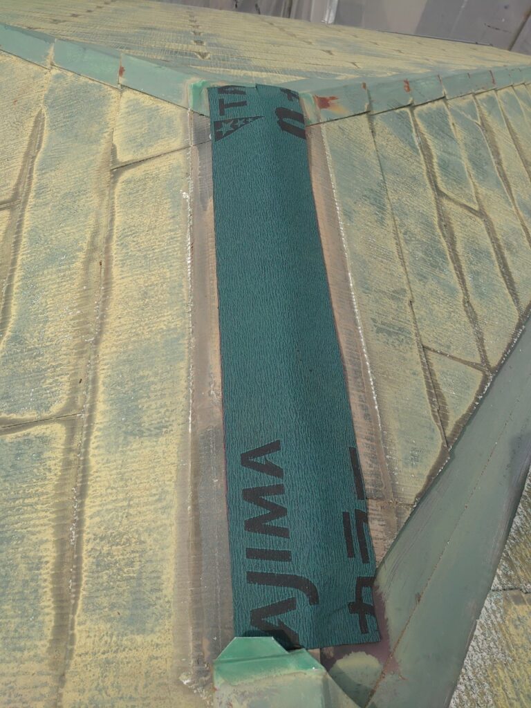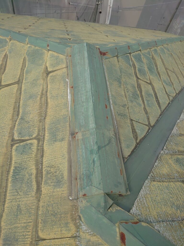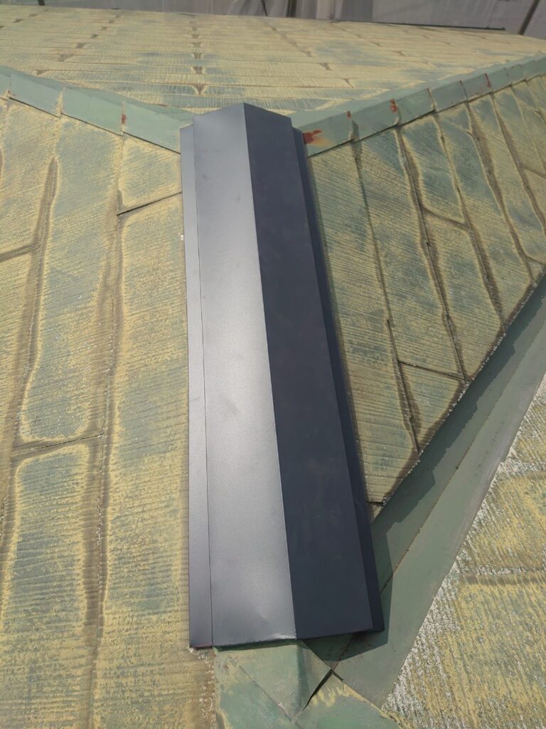 そのため、まずは既存の棟板金を一度取り外し、劣化していた貫板を新しいものに交換しました。下地をしっかりと整えたうえで棟板金を復旧し、屋根塗装の工程へと進めていきます。