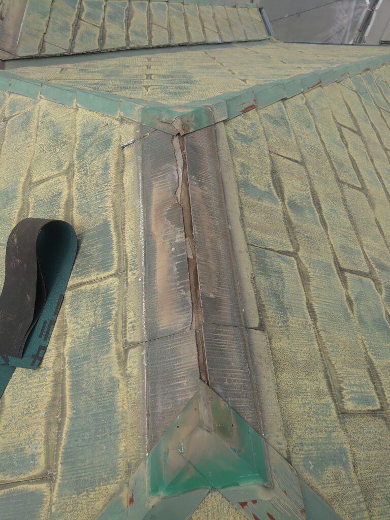 屋根の状態を確認したところ、棟板金部分の下地である貫板が経年劣化している状態でした。
