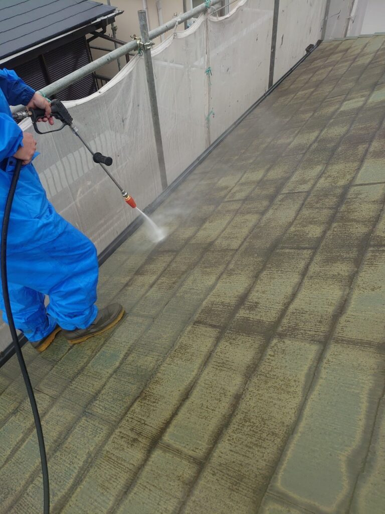 屋根は高圧洗浄で汚れや古い塗装をしっかり落としてから塗装を行い、塗膜をしっかり落としてから塗装を行い、塗膜の密着性と耐久性を高めています。