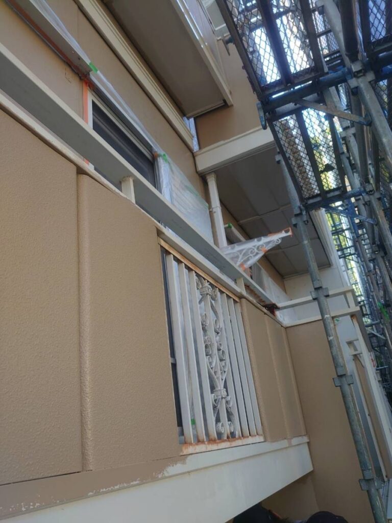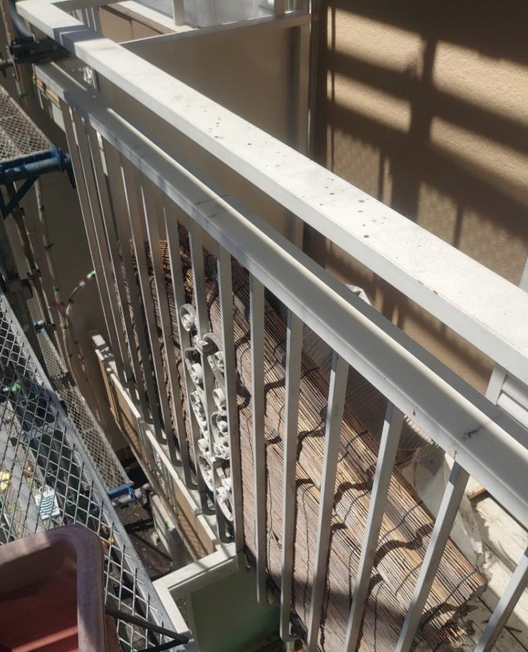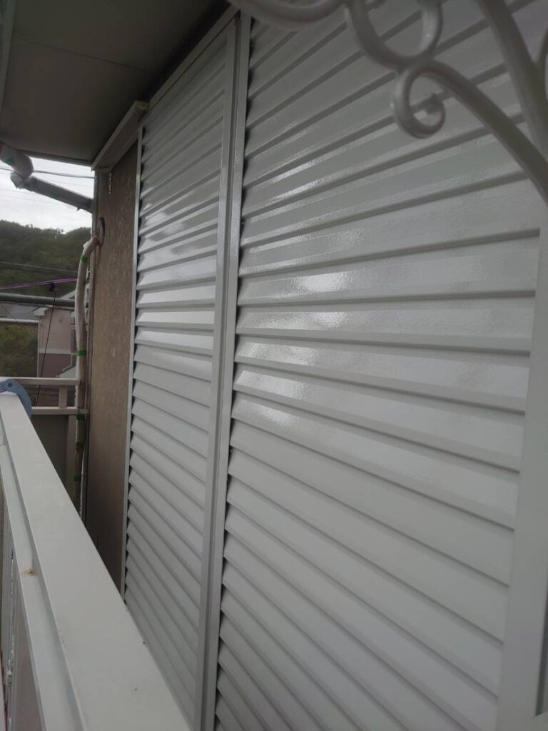 アパートのベランダに設置されているシャッター及び手すり(柵)の塗替え工事事例です。