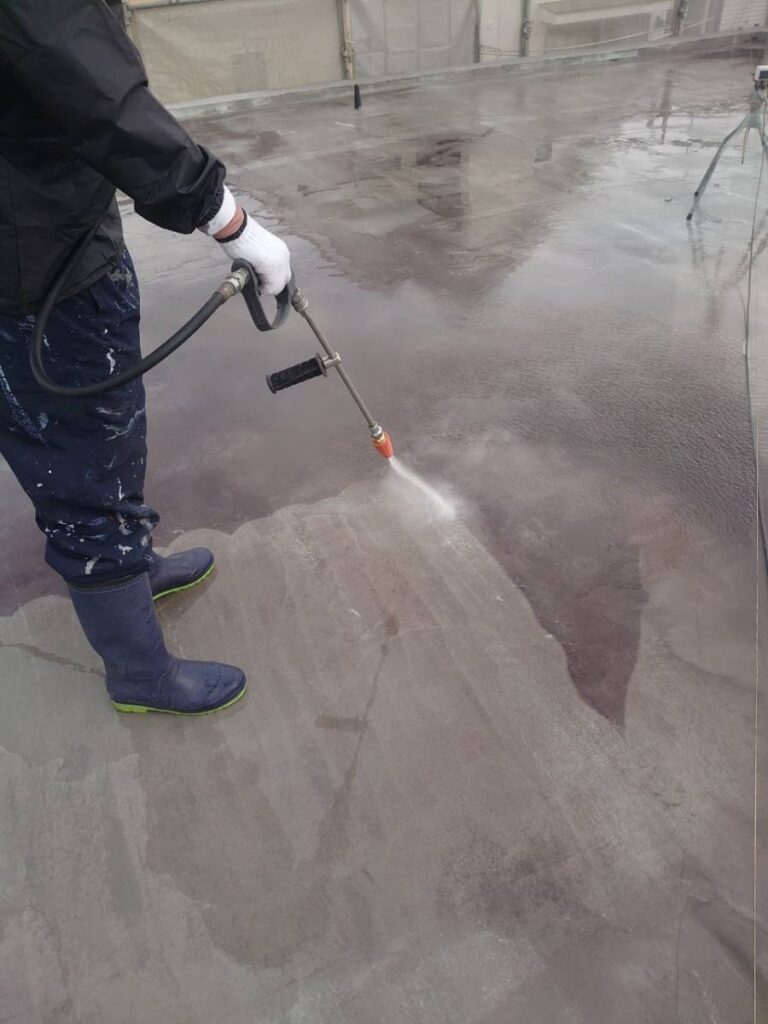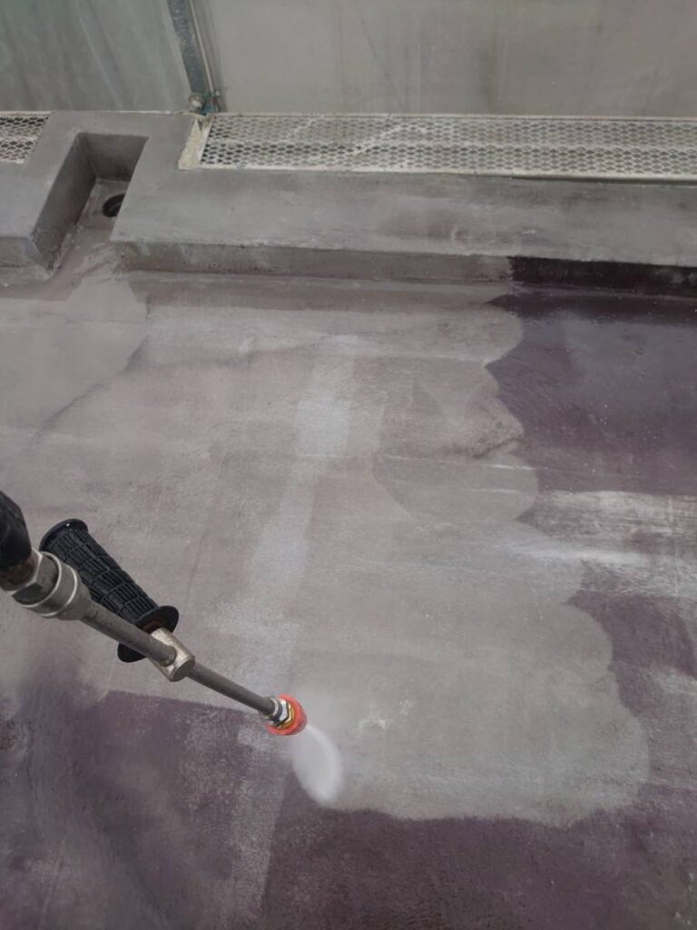 ケレン作業で細かな汚れを落とし、高圧洗浄でコンクリート表面をキレイに洗浄し