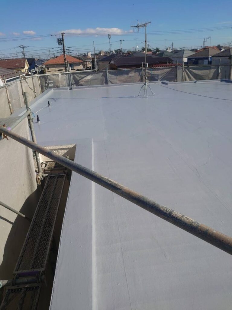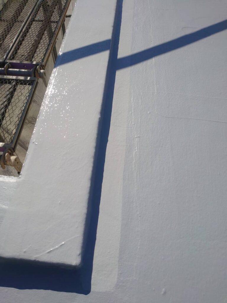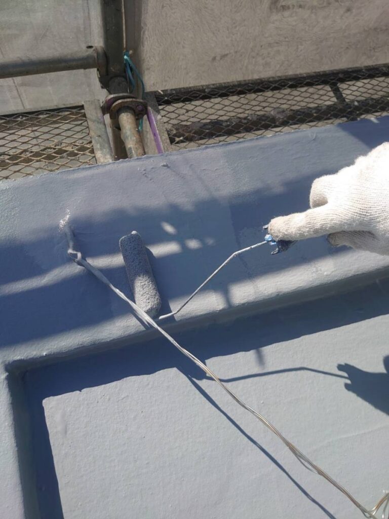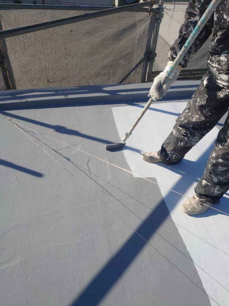 続いて中塗りです。下塗りで整えた屋上に塗膜を重ねることで、