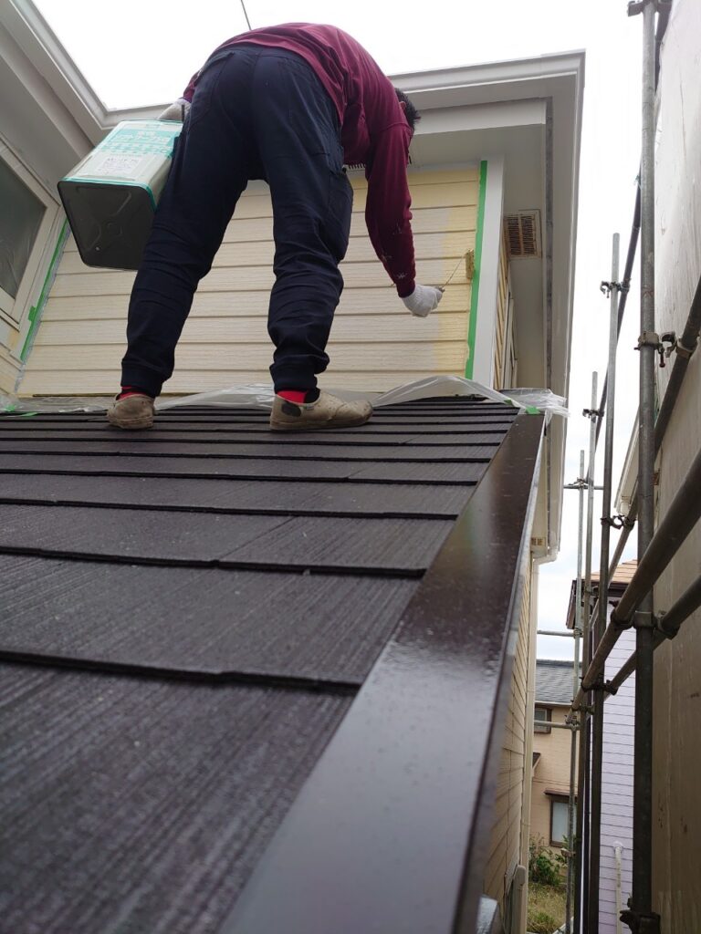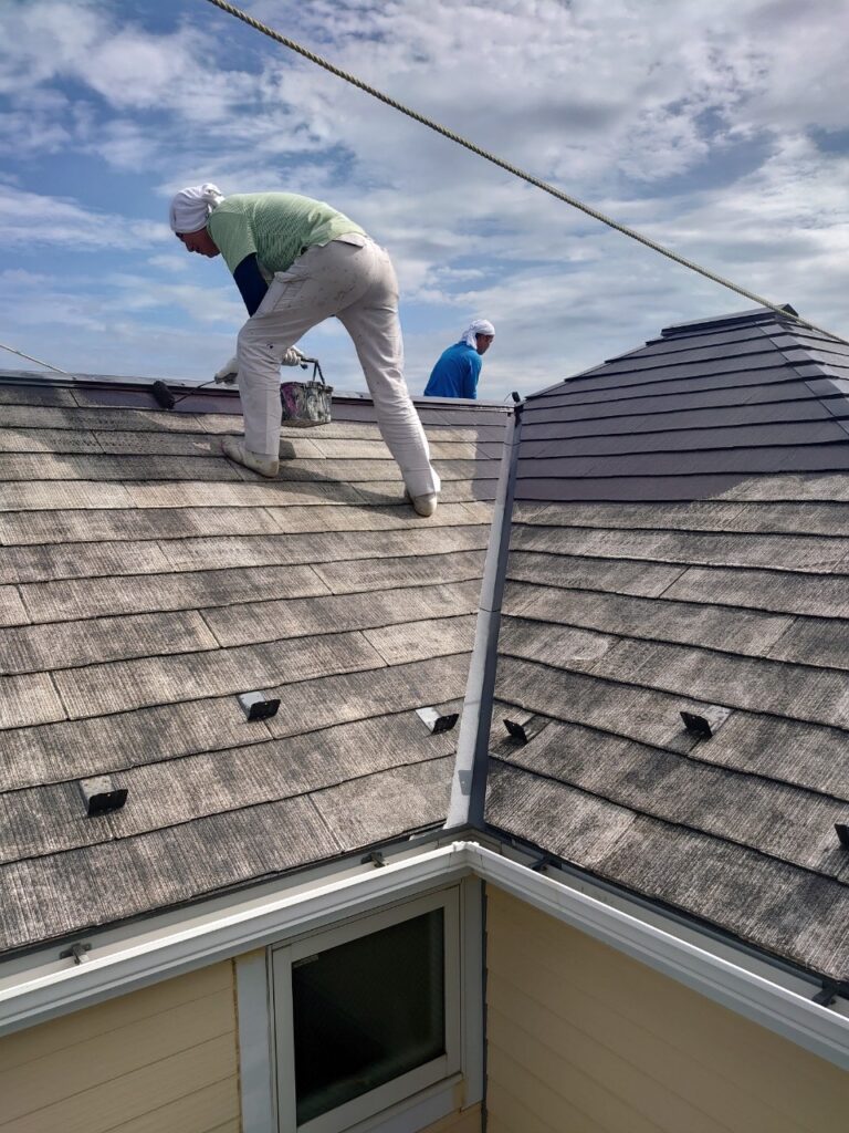 屋根材と塗料の密着力を高めるための下塗り作業。