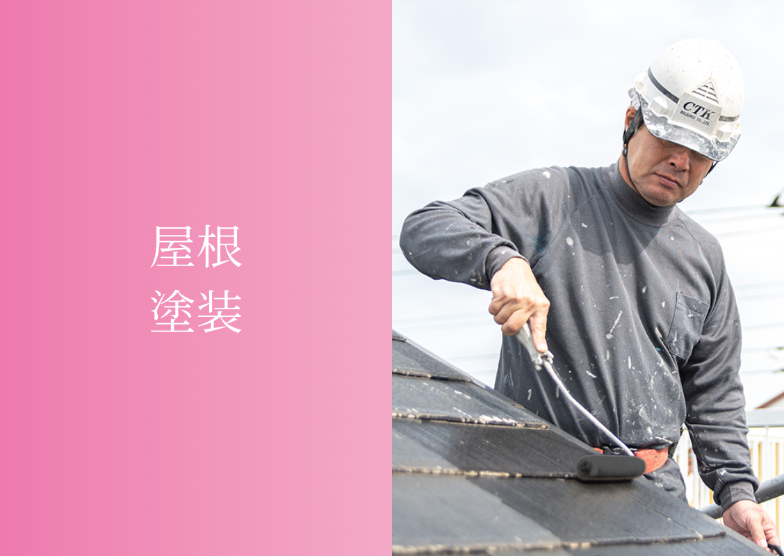 まずは下塗りを行ないます。これは屋根と塗料をしっかりと密着させるために必要な大切な工程です。下地となる屋根材に応じて、それぞれに合った「下地強化材」を使用するのがポイントです。